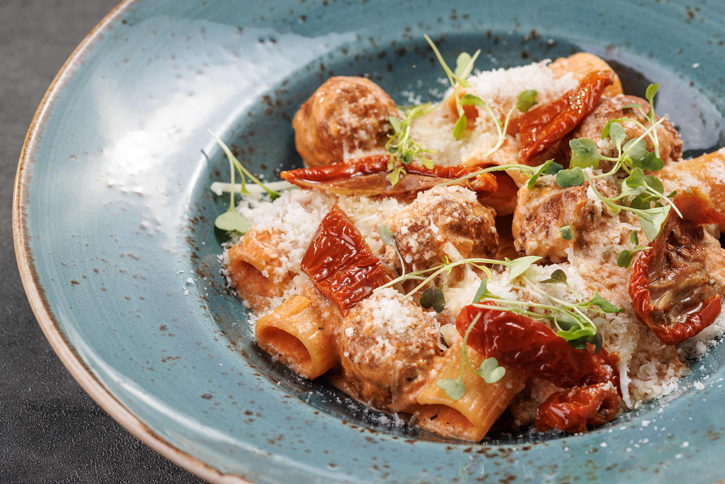 митболы из говядины и свинины, лук репчатый, сливки, соус маринара, сыр пармезан, томаты черри, сливочное масло, паста ригатони.