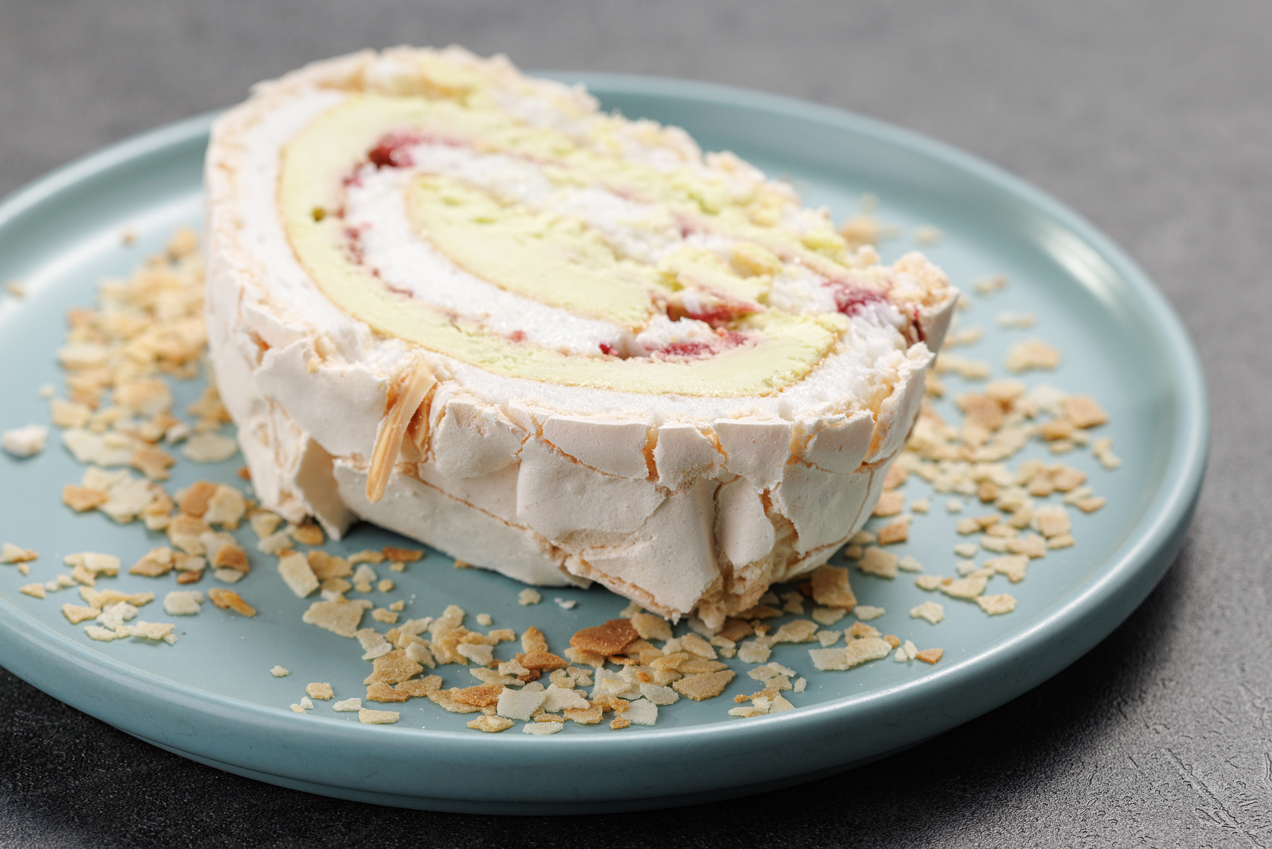 МЕРЕНГОВЫЙ РУЛЕТ С ФИСТАШКОЙ И МАЛИНОЙ