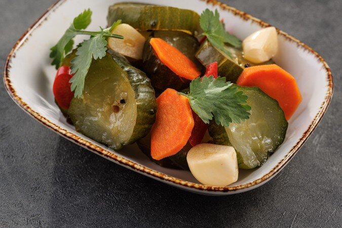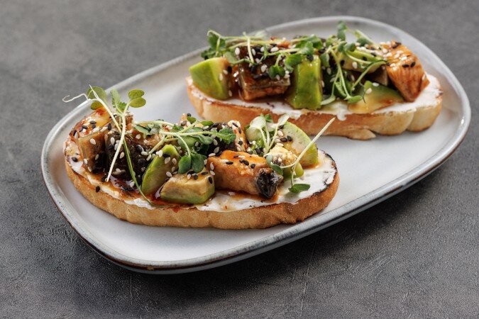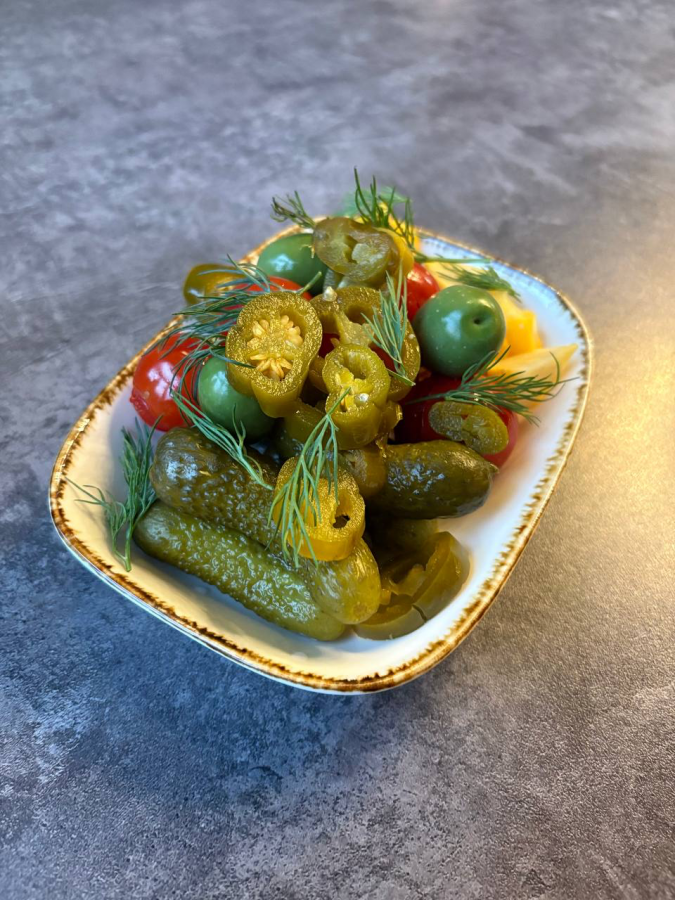 Томаты черри, огурцы, болгарский перец, сельдерей, редис, зеленый лук, соус мятный песто.